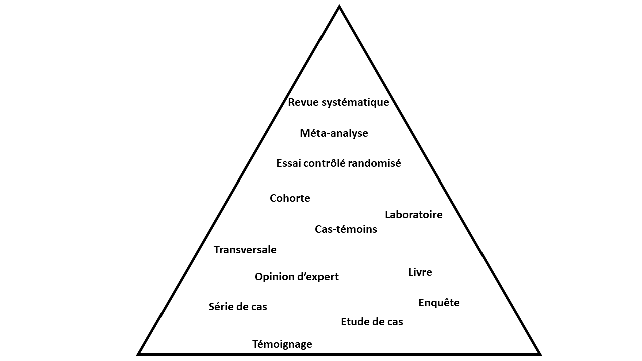 Sur la base des 2 sections précédentes, un classement du niveau de preuve associé à différents types de sources peut être proposé. Ce type de classement est appelé en anglais hierarchy of evidence. Il n’a pas de valeur absolue, mais peut servir de base dans l’évaluation des informations trouvées.