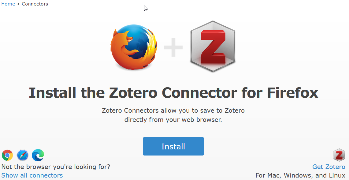 La façon la plus pratique et la plus rapide d’importer des références dans le logiciel est via l’utilisation d’un bouton d’import dans votre navigateur internet. Pour cela, un module d’import doit être installé. La procédure d’installation est la suivante. Dans la barre de menus du logiciel Zotero, cliquez sur Outils / Installer le Connecteur Zotero dans le Navigateur. Lorsque vous cliquez sur ce menu, une page internet s’ouvre dans votre navigateur par défaut. Cliquez sur Install.