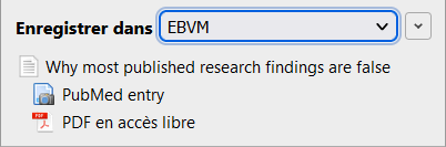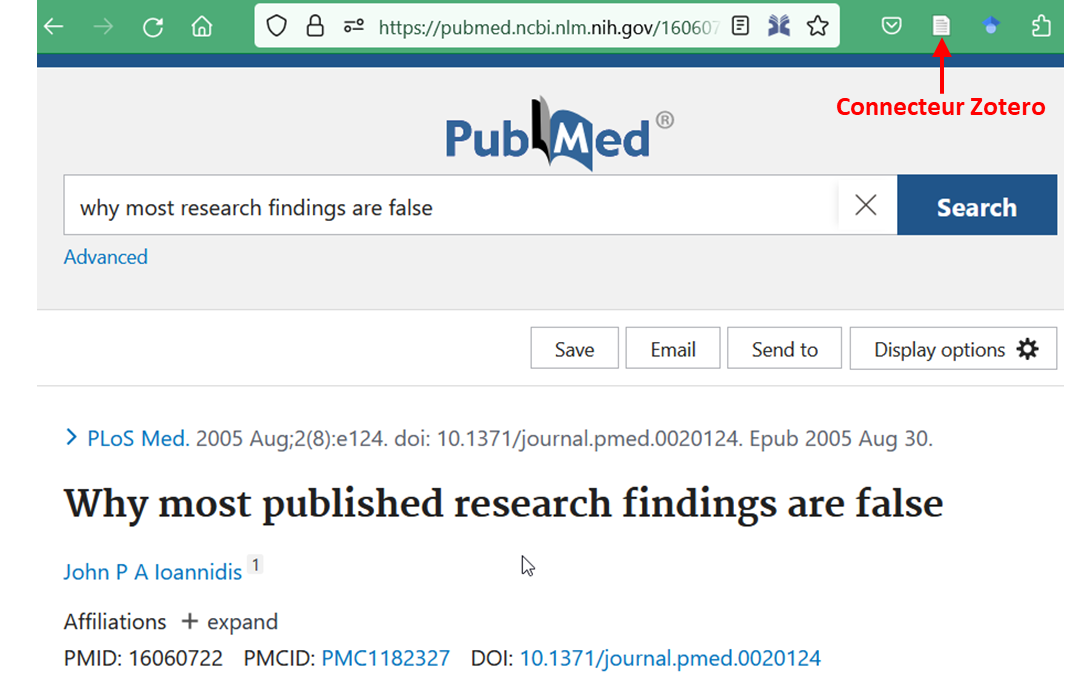 Une fois le connecteur installé, il devient possible d’importer des références d’articles depuis la page PubMed ou la page internet de l’article en cliquant sur le bouton du connecteur Zotero. L’import nécessite que Zotero soit ouvert.