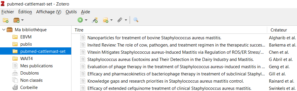 Vous pouvez vérifier que les références ont été importées dans Zotero, et placées dans une nouvelle collection qui porte le nom du fichier depuis lequel l’import a été réalisé. Il est possible de renommer cette collection ou de copier-coller les références dans un autre emplacement.