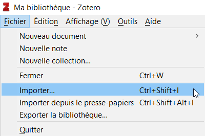 Il est possible d’importer des références exportées depuis un autre logiciel ou exportées depuis un site internet tel que PubMed. Reprenons le fichier exporté depuis PubMed plus haut. Cliquez sur Fichier / Importer.