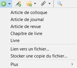 Il est possible d’entrer des références manuellement en cliquant sur le + vert au-dessous de la barre de menus. Une fois le type de référence sélectionné, les différents champs sont à renseigner. Noter que les articles scientifiques sont à saisir en tant qu’articles de revues.